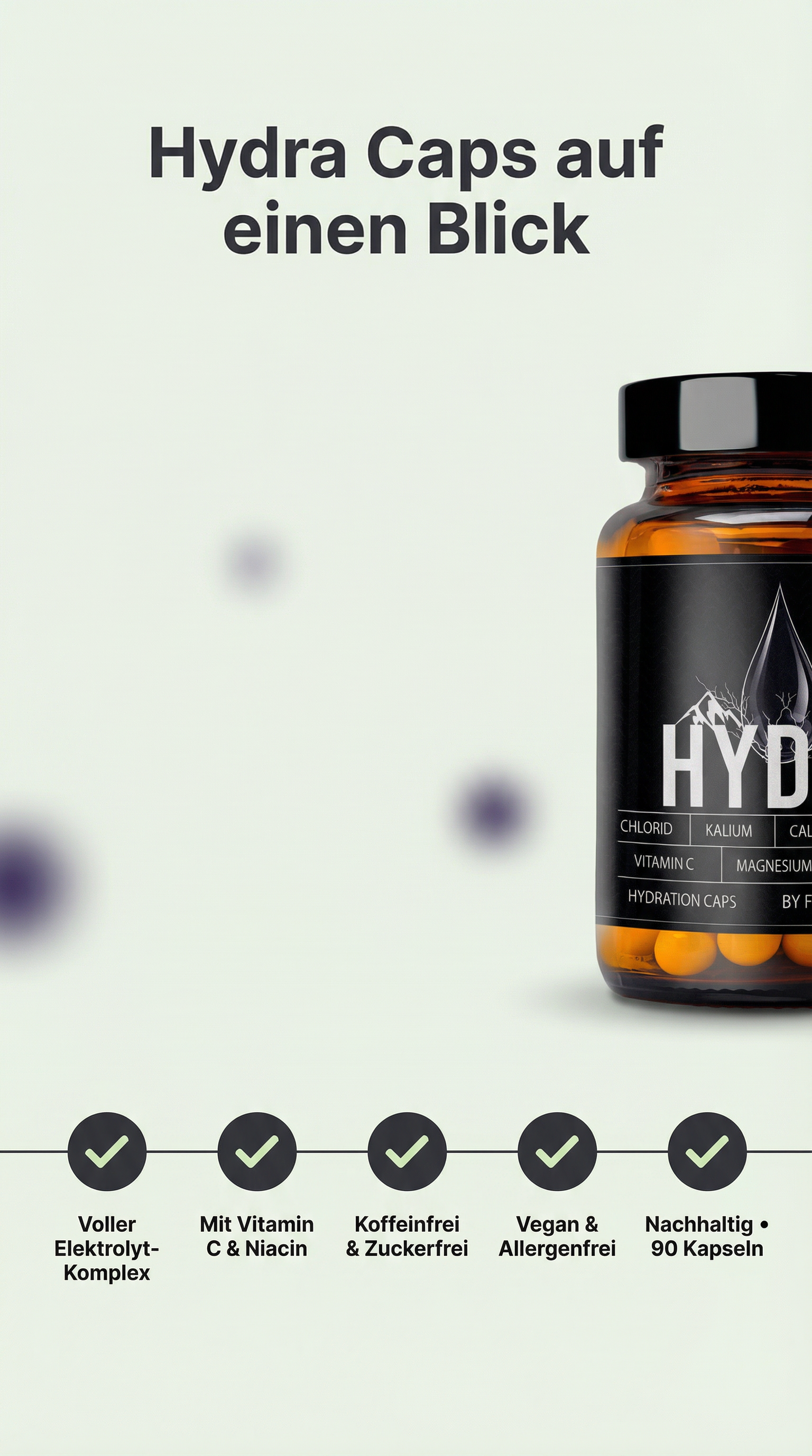Gerade bei Supplements suchen viele Nutzer nach "Elektrolyt Kapseln vegan", "Hydration Kapseln ohne Koffein" oder "natürliche Energie ohne Zucker". Deshalb ist es wichtig: Hydra Caps sind vegan, vollständig allergenfrei und im nachhaltigen Glasbehälter abgefüllt. Hergestellt in der EU unter streng kontrollierten Qualitätsstandards. Kein Plastikmüll, keine unnötigen Füllstoffe – nur das, was reingehört.
