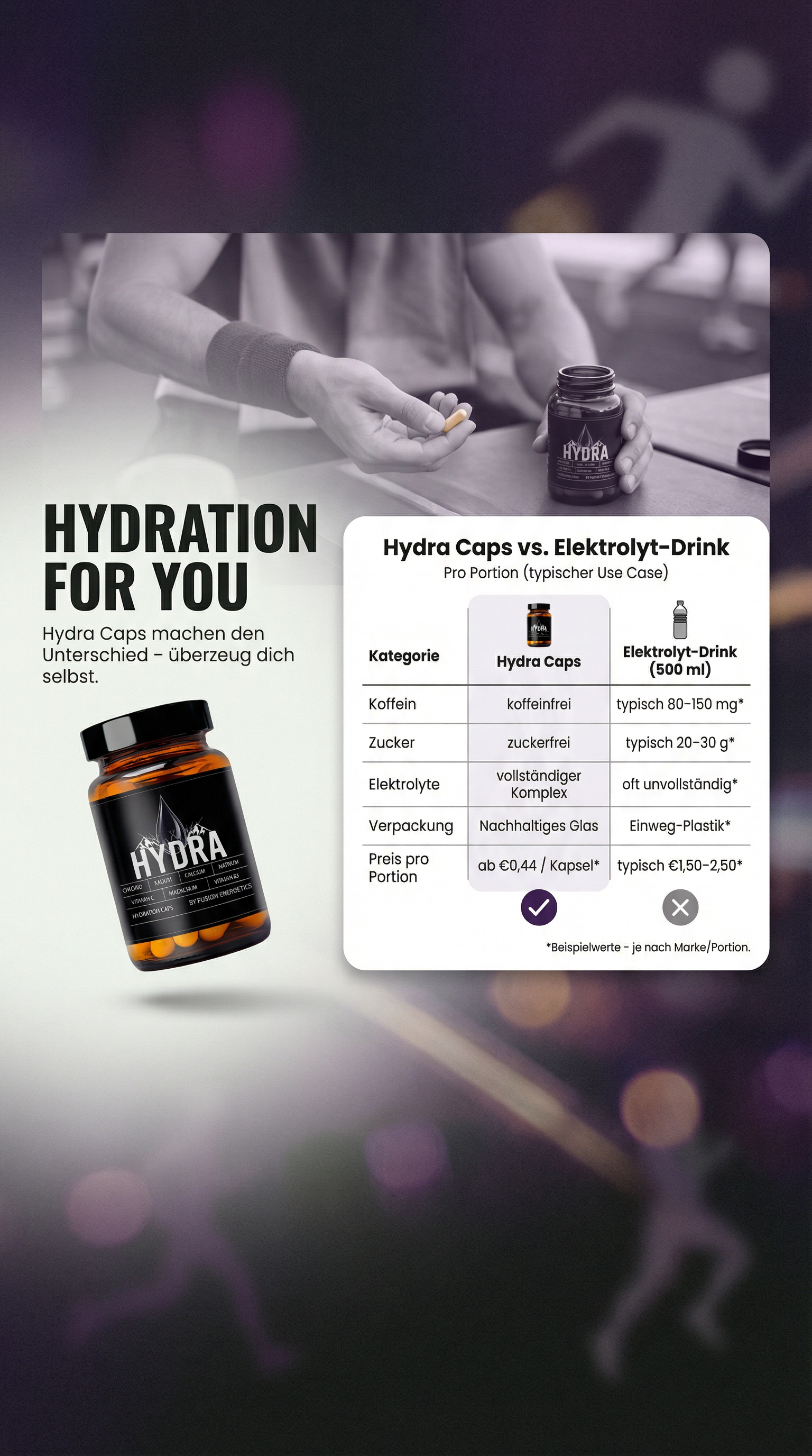 Hydra Caps sind Elektrolyt-Kapseln mit einem vollständigen Mineralstoff- und Vitaminkomplex: Kalium, Calcium, Natrium, Chlorid, Magnesium, Vitamin C und Niacin. Sie sind speziell dafür entwickelt, deinen Elektrolythaushalt natürlich zu unterstützen – ohne Koffein, ohne Zucker und ohne künstliche Zusätze. Anders als ein klassischer Energy Sniff setzen Hydra Caps auf nachhaltige Balance statt kurzfristigen Push.